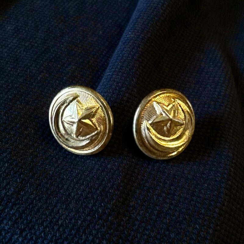 Deze set vintage goudkleurige sterknopen is zo’n detail waar je oog direct naartoe trekt. De knopen hebben een mooie glans en een opvallend reliëf met ster in het midden, omlijst met subtiele ringen en fijne textuur. Op een navy blazer zijn ze echt perfect: classy, krachtig en nét even anders dan standaard.