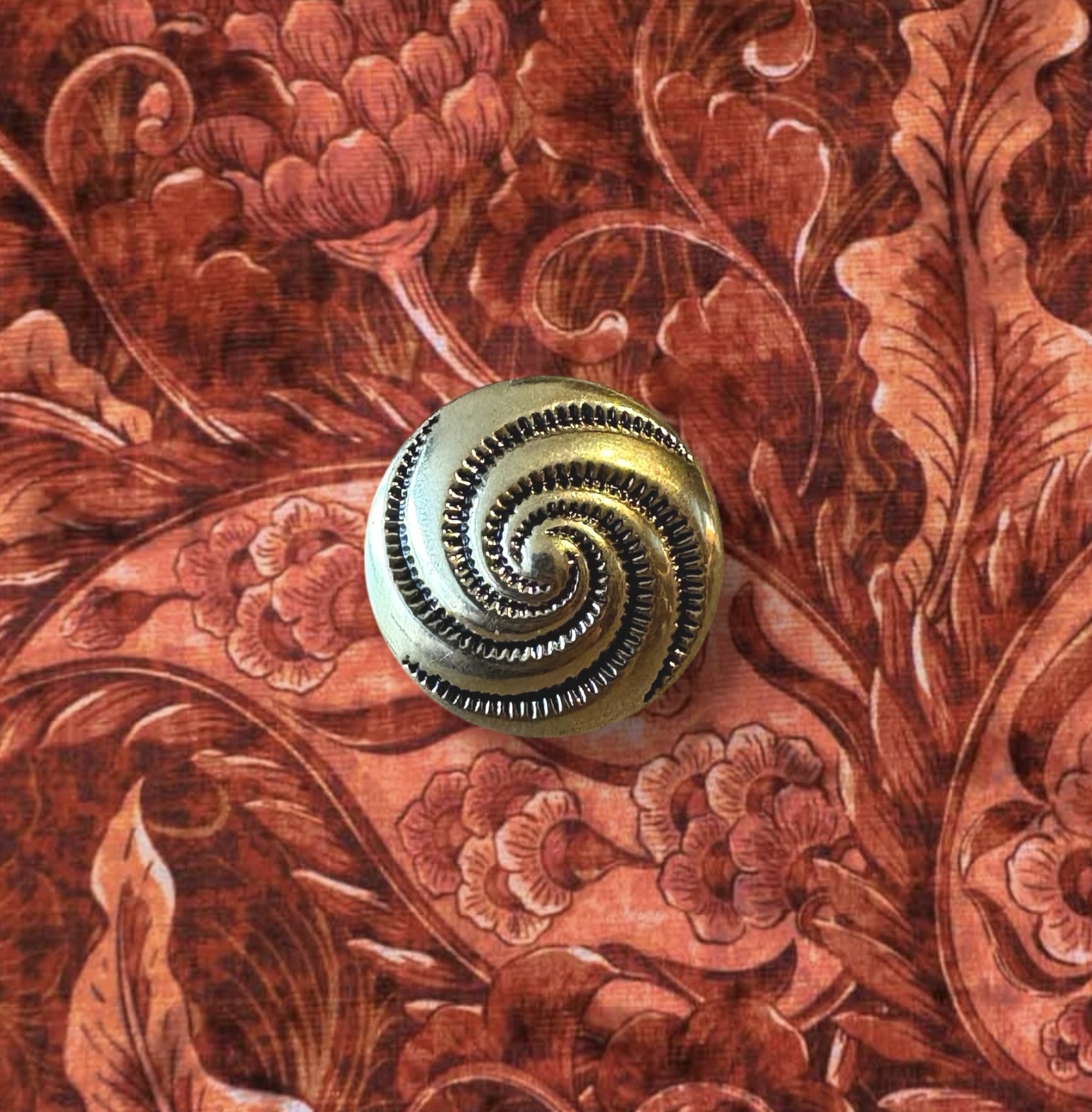 Deze vintage spiraalknoop is zo’n detail waar je outfit ineens “af” van voelt. Het spiraalpatroon heeft een mooie diepte door de zwarte accenten, waardoor de goudtint extra warm en luxe oogt. De vorm is klassiek, maar door het grafische reliëf ook lekker eigenwijs.