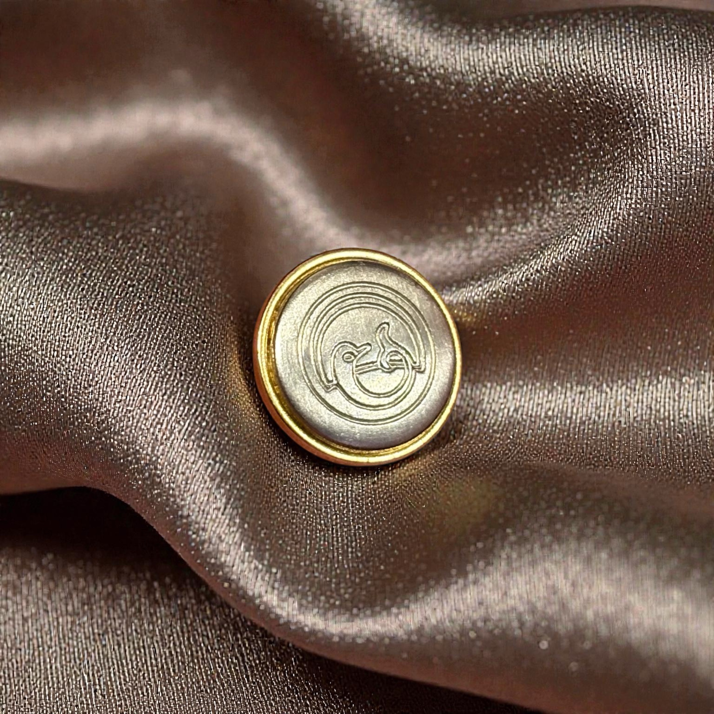 Deze knoop is heel bijzonder. Hij is gemaakt van metaal en hij heeft een soort abstracte afbeelding van een dolfijn(?). Hij heeft een art deco vibe, maar we vermoeden dat deze knoop geproduceerd is in de jaren 70. Deze knoopjes zijn 15mm en daardoor heel geschikt als mouwknoopjes voor een colbert.
